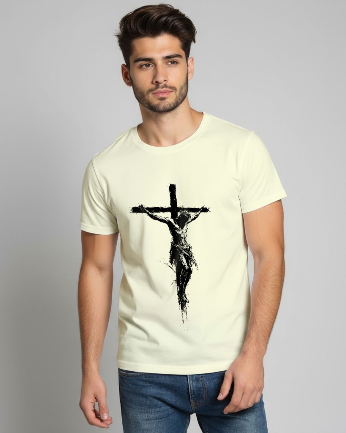 Arjun Desai the “Jesus” artwork blends into the tee naturally.